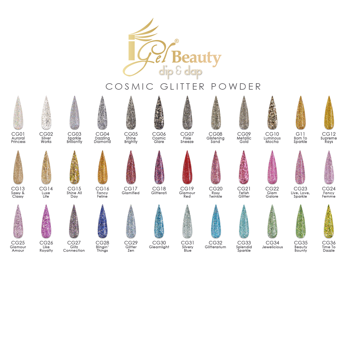Strong and sparkly! Our iGel Dip & Dap Powder - Cosmic Glitter line is formulated without harsh chemicals and has added vitamins and calcium to strengthen your natural nails!