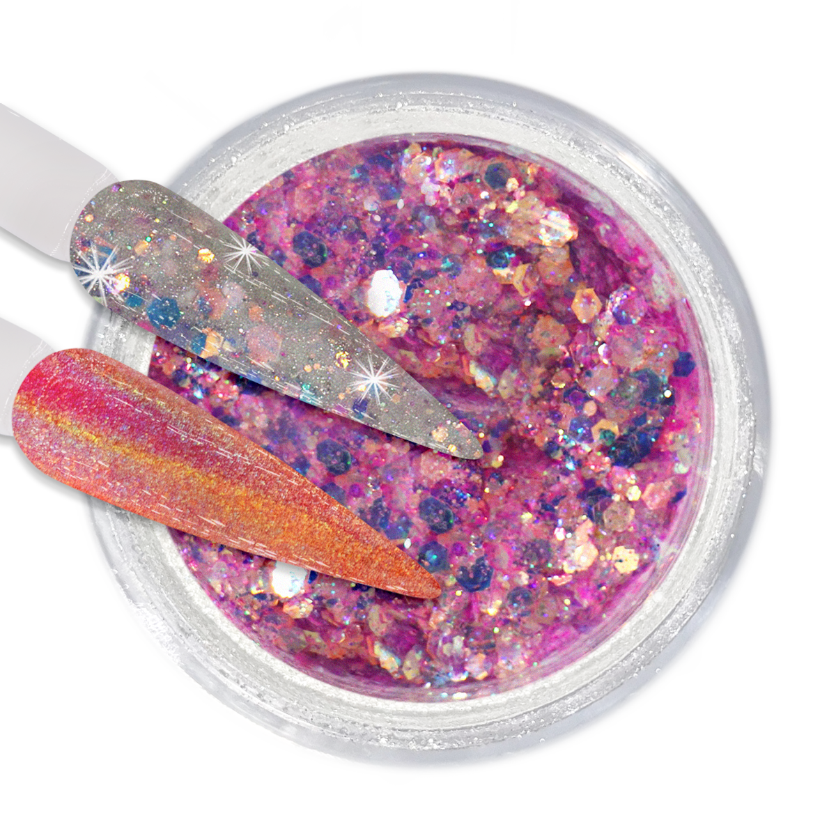 Create your own rainbow sugar effect or chrome effect with these Dip & Dap Holo Chrome Powders! Each jar contains mixed glitters that sparkle when you dip or dap in addition to having the finest holographic powder for a mirror holographic chrome finish!