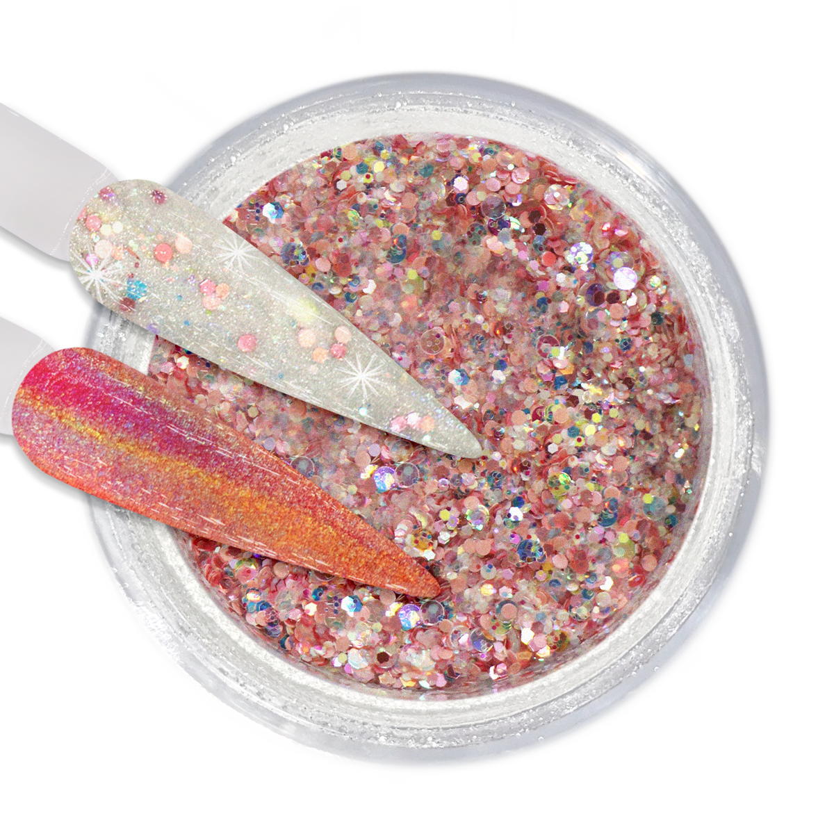 Create your own rainbow sugar effect or chrome effect with these Dip & Dap Holo Chrome Powders! Each jar contains mixed glitters that sparkle when you dip or dap in addition to having the finest holographic powder for a mirror holographic chrome finish!